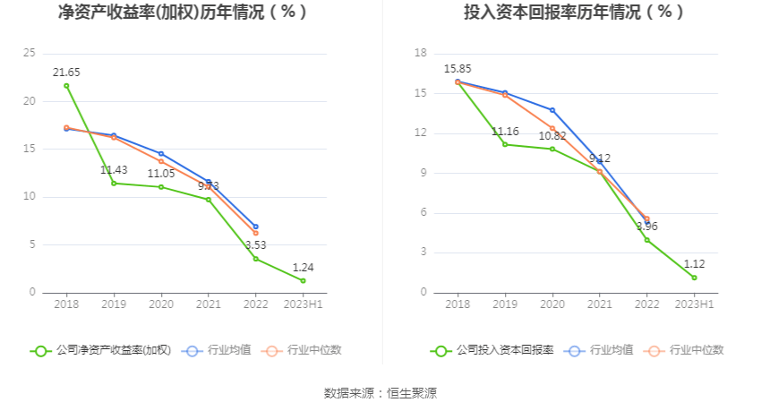 数据显示,2023年上半年公司加权平均净资产收益率为1.24%,较上年同期下降0.51个百分点;公司2023年上半年投入资本回报率为1.12%,较上年同期下降0.77个百分点。