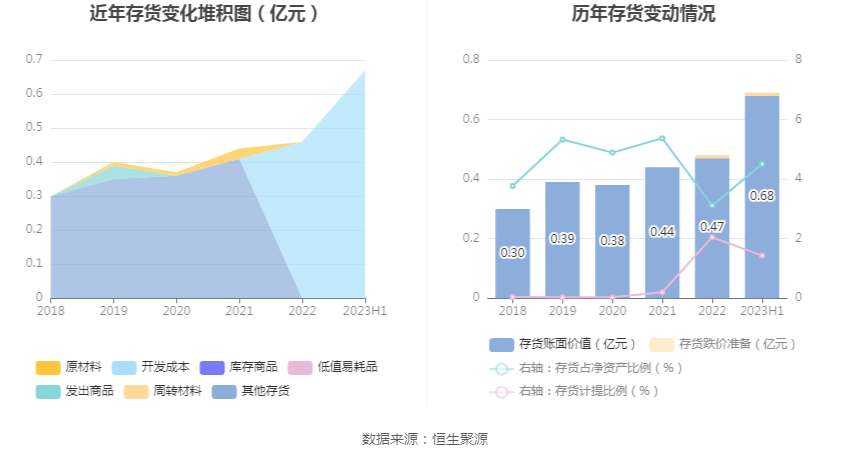 从存货变动来看,截至2023年上半年末,公司存货账面价值为6755.97万元,占净资产的4.51%,较上年末增加2078.73万元。其中,存货跌价准备为97.83万元,计提比例为1.43%。