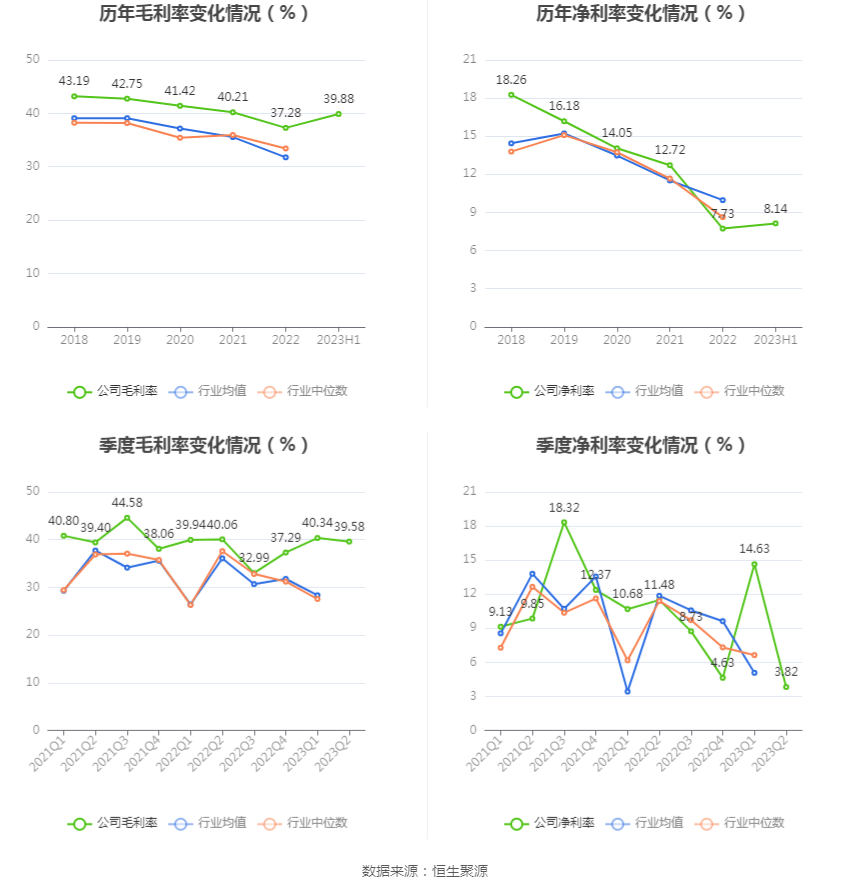 2023年上半年,公司毛利率为39.88%,同比下降0.13个百分点;净利率为8.14%,较上年同期下降3.02个百分点。从单季度指标来看,2023年第二季度公司毛利率为39.58%,同比下降0.48个百分点,环比下降0.76个百分点;净利率为3.82%,较上年同期下降7.66个百分点,较上一季度下降10.81个百分点。