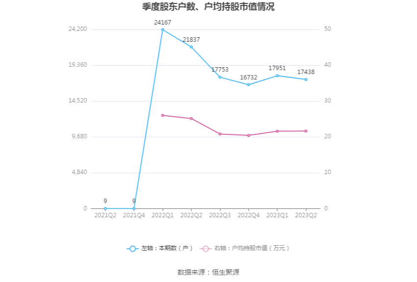筹码集中度方面,截至2023年二季度末,公司股东总户数为1.74万户,较一季度末下降了513户,降幅2.86%;户均持股市值由一季度末的21.60万元上升至21.65万元,增幅为0.23%。