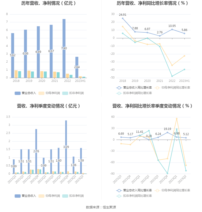 根据半年报,公司第二季度实现营业总收入1.59亿元,同比增长5.12%,环比增长50.21%;归母净利润495.03万元,同比下降67.72%,环比下降64.19%;扣非净利润249.43万元,同比下降81.81%,环比下降77.31%。