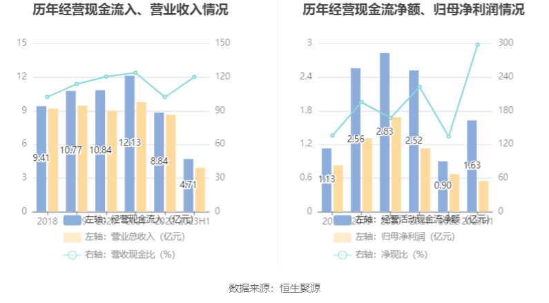 2023年上半年,公司营业收入现金比为120.22%,净现比为298.05%。