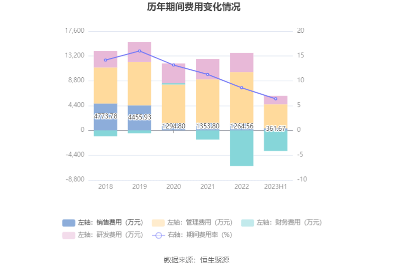 2023年上半年,公司期间费用为2498.86万元,较上年同期减少242.91万元;期间费用率为6.38%,较上年同期下降0.38个百分点。其中,销售费用同比下降20.17%,管理费用同比增长5.2%,研发费用同比下降11.45%,财务费用由去年同期的-3479.02万元变为-3647.73万元。