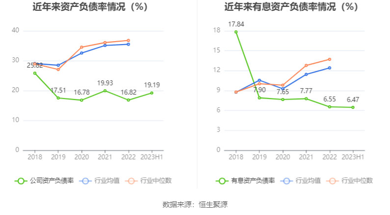 偿债能力方面,公司2023年二季度末资产负债率为19.19%,相比上年末增加2.37个百分点;有息资产负债率为6.47%,相比上年末减少0.08个百分点。