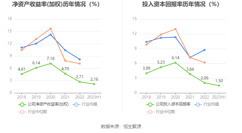数据显示,2023年上半年公司加权平均净资产收益率为2.16%,较上年同期下降0.28个百分点;公司2023年上半年投入资本回报率为1.50%,较上年同期下降0.43个百分点。
