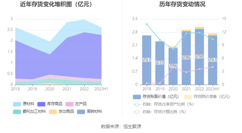 从存货变动来看,截至2023年上半年末,公司存货账面价值为2.63亿元,占净资产的10.42%,较上年末减少3549.25万元。其中,存货跌价准备为1109.54万元,计提比例为4.05%。