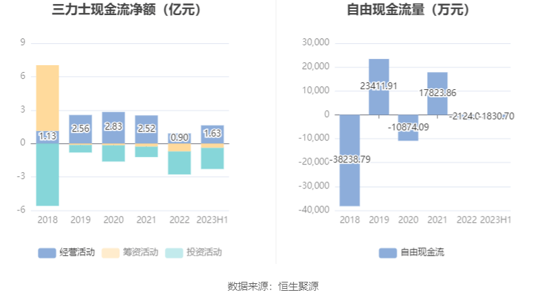 2023上半年,公司经营活动现金流净额为1.63亿元,同比增长7029.55%;筹资活动现金流净额-3882.44万元,同比减少2146.36万元;投资活动现金流净额-1.90亿元,上年同期为-1.55亿元。