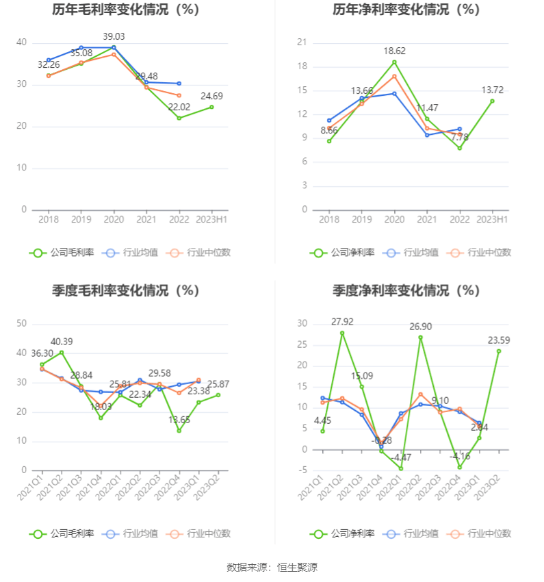 2023年上半年,公司毛利率为24.69%,同比上升1.01个百分点;净利率为13.72%,较上年同期下降1.07个百分点。从单季度指标来看,2023年第二季度公司毛利率为25.87%,同比上升3.53个百分点,环比上升2.49个百分点;净利率为23.59%,较上年同期下降3.31个百分点,较上一季度上升20.75个百分点。
