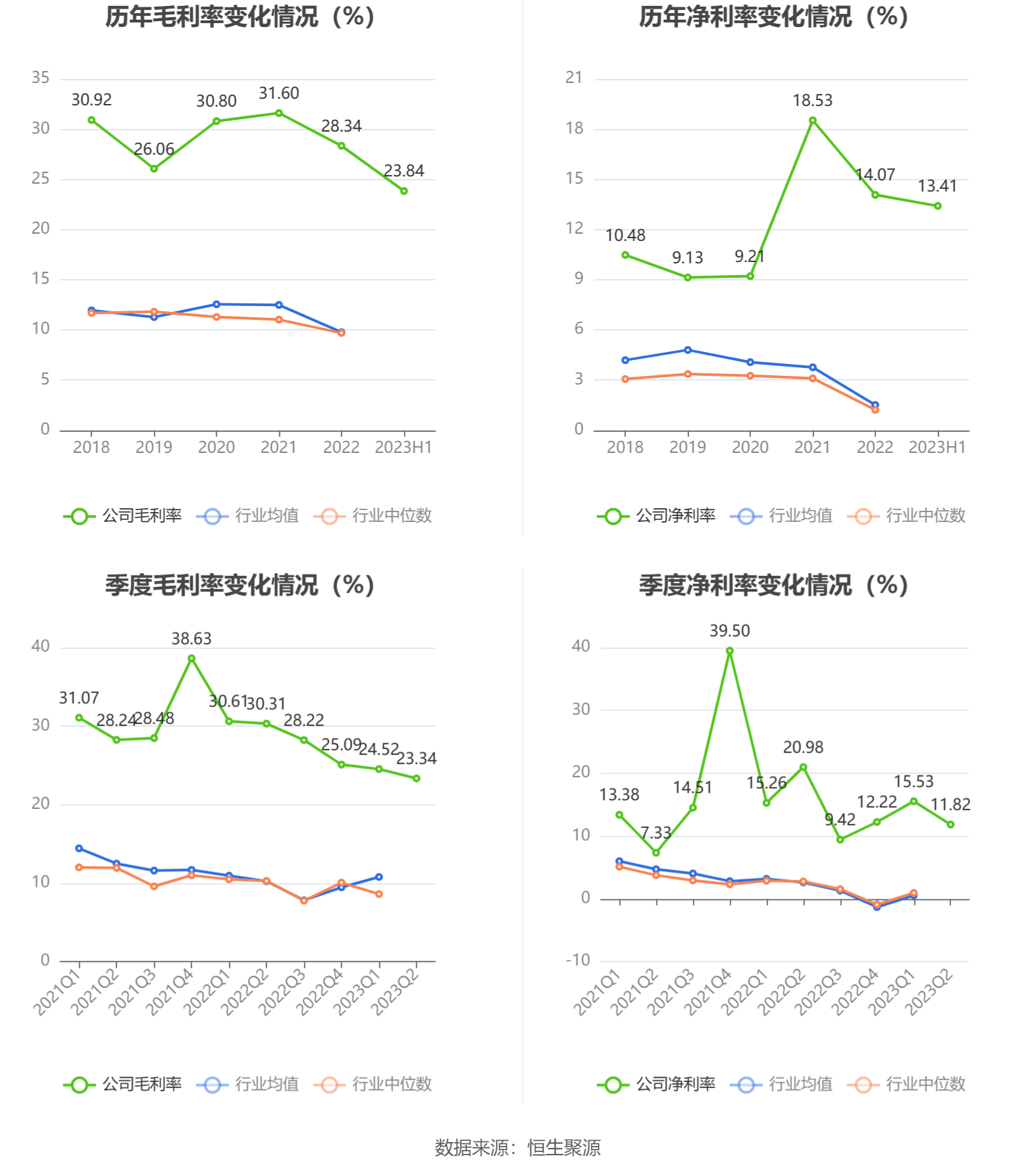 2023年上半年,公司毛利率为23.84%,同比下降6.62个百分点;净利率为13.41%,较上年同期下降4.75个百分点。从单季度指标来看,2023年第二季度公司毛利率为23.34%,同比下降6.97个百分点,环比下降1.18个百分点;净利率为11.82%,较上年同期下降9.16个百分点,较上一季度下降3.71个百分点。