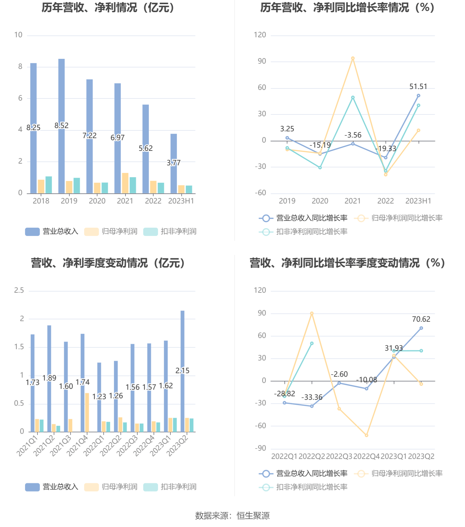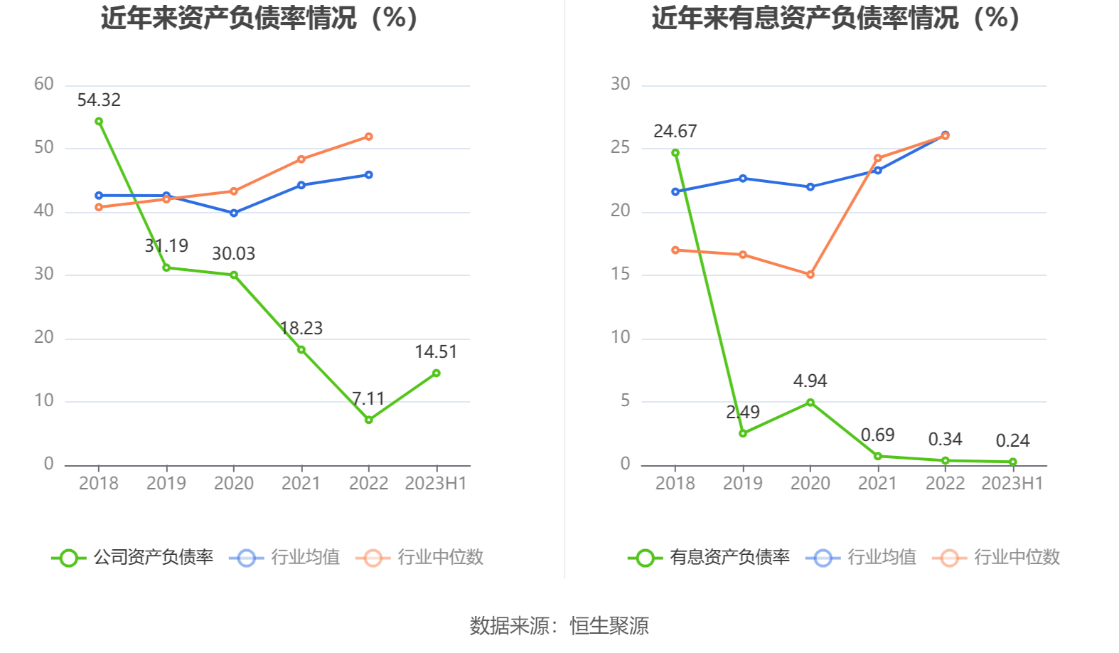 偿债能力方面,公司2023年二季度末资产负债率为14.51%,相比上年末增加7.40个百分点;有息资产负债率为0.24%,相比上年末减少0.10个百分点。