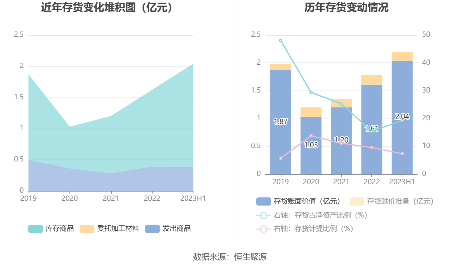 从存货变动来看,截至2023年上半年末,公司存货账面价值为2.04亿元,占净资产的19.27%,较上年末增加4253.47万元。其中,存货跌价准备为1619.08万元,计提比例为7.36%。