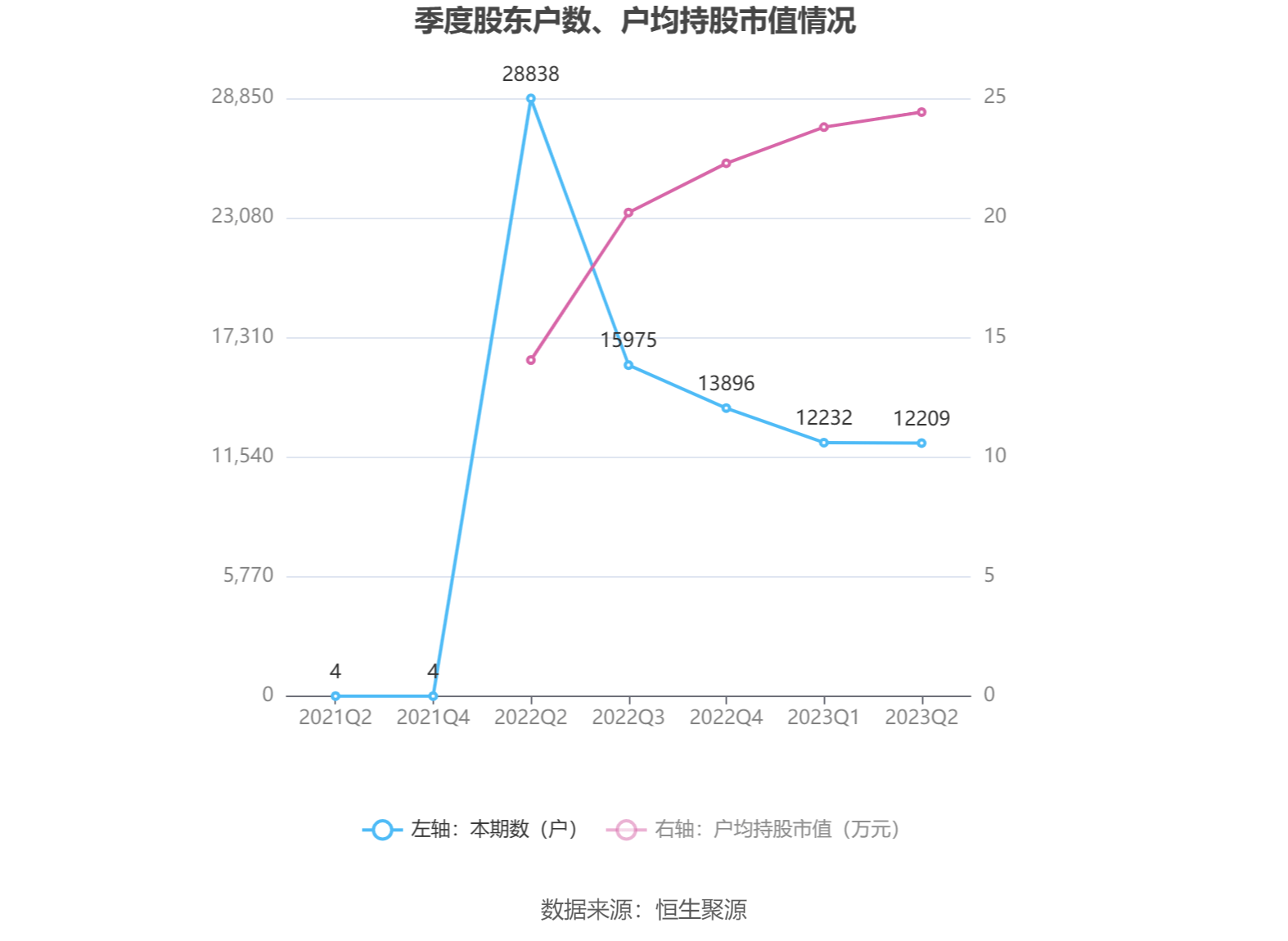 筹码集中度方面,截至2023年二季度末,公司股东总户数为1.22万户,较一季度末下降了23户,降幅0.19%;户均持股市值由一季度末的23.79万元上升至24.42万元,增幅为2.65%。