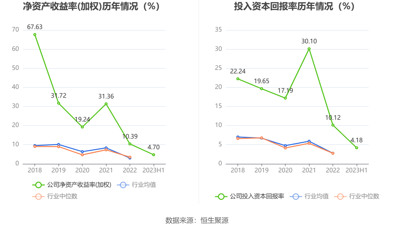数据显示,2023年上半年公司加权平均净资产收益率为4.70%,较上年同期下降4.29个百分点;公司2023年上半年投入资本回报率为4.18%,较上年同期下降1.86个百分点。