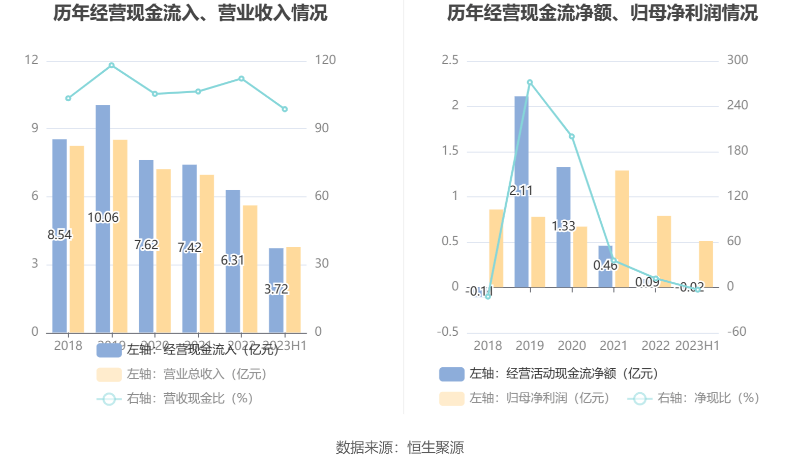2023年上半年,公司营业收入现金比为98.72%,净现比为-3.19%。