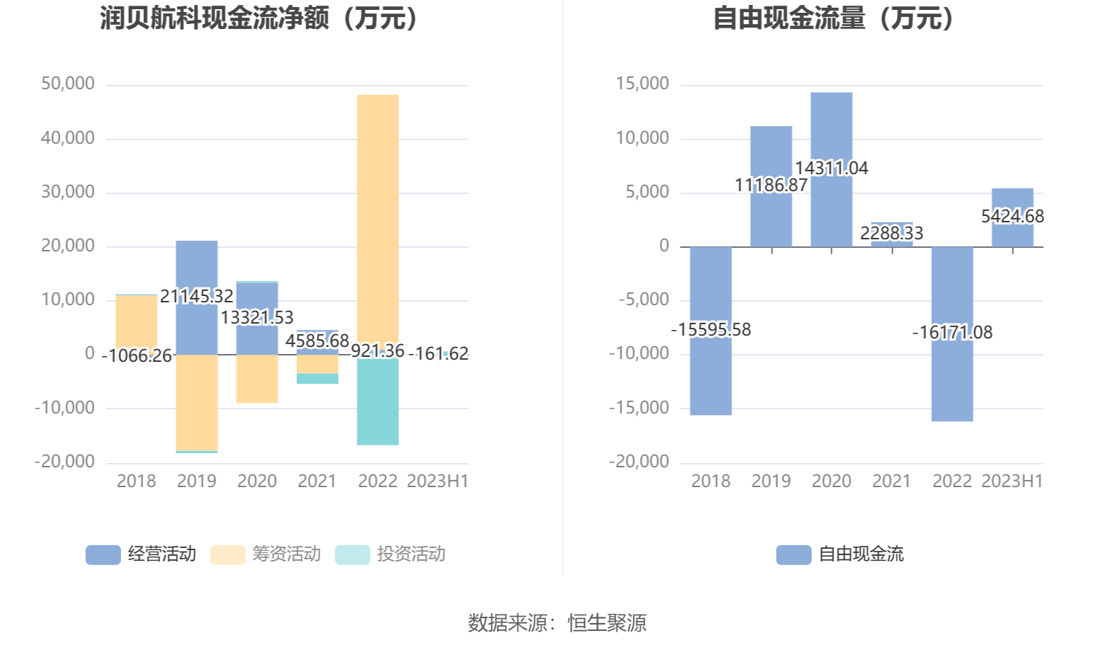 2023上半年,公司经营活动现金流净额为-161.62万元,同比增加489.66万元;筹资活动现金流净额-239.33万元,同比减少5.02亿元;投资活动现金流净额644.53万元,上年同期为-3499.92万元。