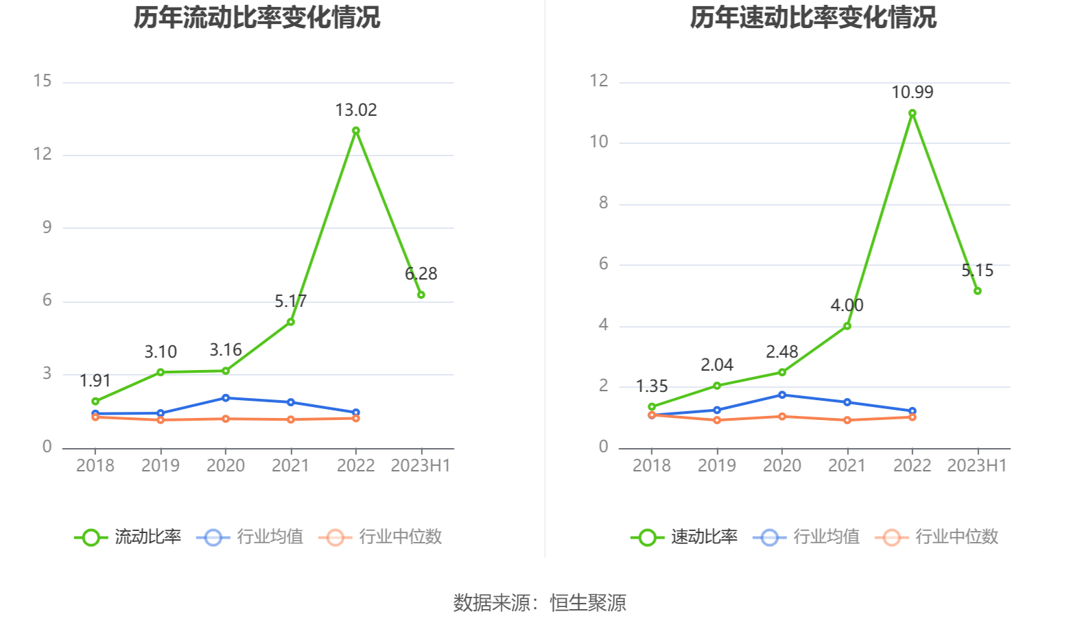 2023年上半年,公司流动比率为6.28,速动比率为5.15。