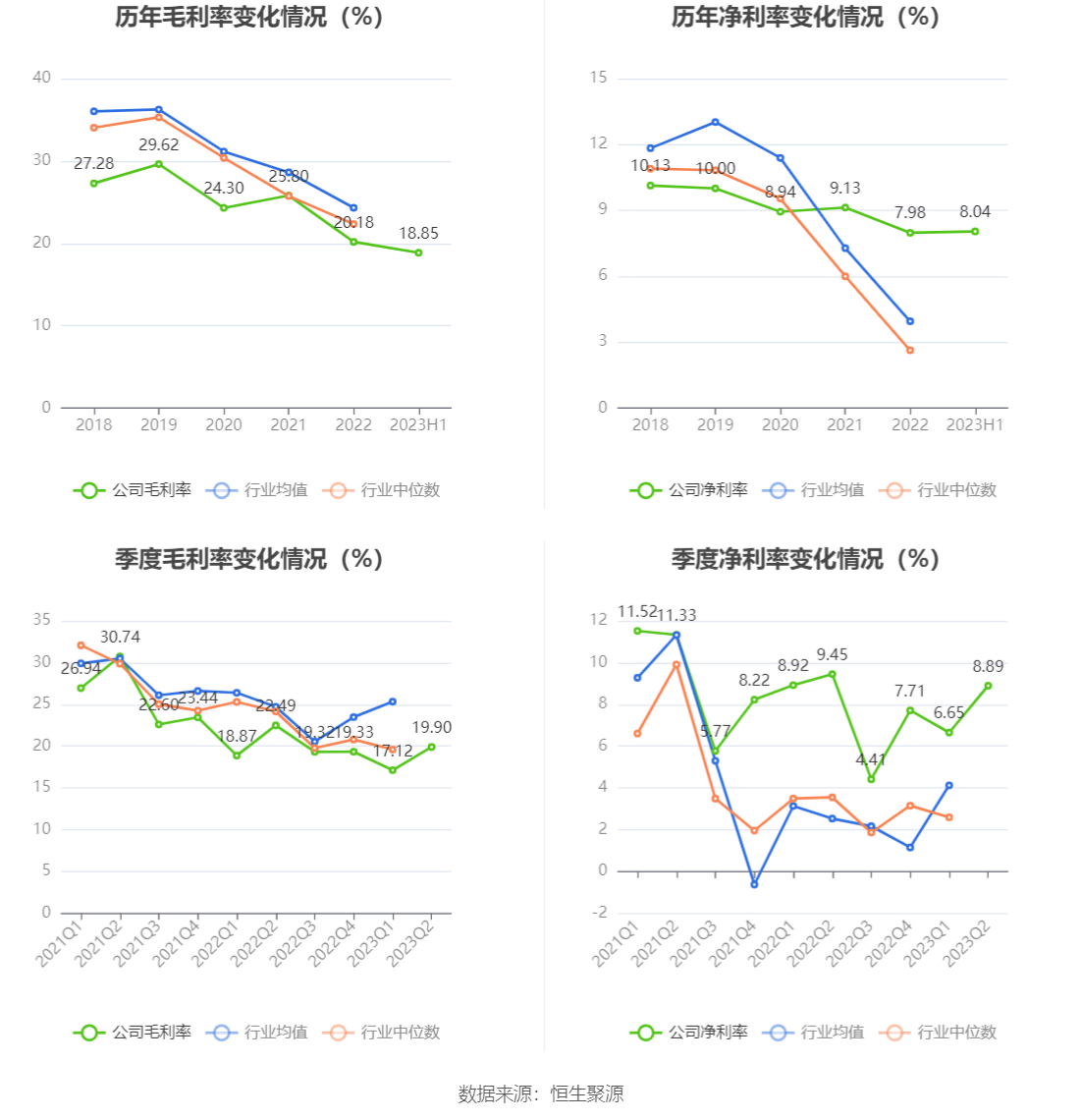 2023年上半年,公司毛利率为18.85%,同比下降2.46个百分点;净利率为8.04%,较上年同期下降1.23个百分点。从单季度指标来看,2023年第二季度公司毛利率为19.90%,同比下降2.59个百分点,环比上升2.78个百分点;净利率为8.89%,较上年同期下降0.56个百分点,较上一季度上升2.24个百分点。