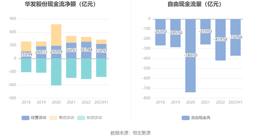 进一步统计发现,2023年上半年公司自由现金流为-371.66亿元,上年同期为-195.64亿元。