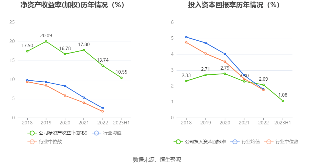 数据显示,2023年上半年公司加权平均净资产收益率为10.55%,较上年同期增长0.71个百分点;公司2023年上半年投入资本回报率为1.08%,较上年同期增长0.03个百分点。