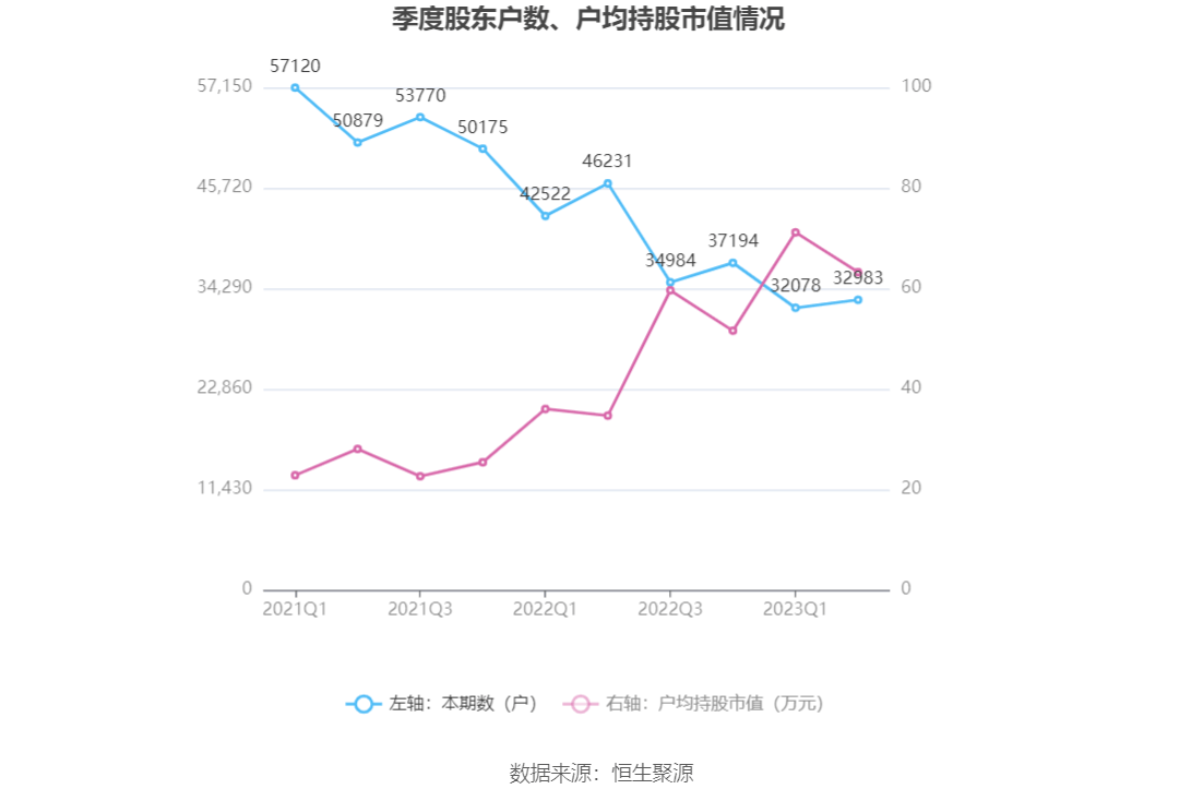 筹码集中度方面,截至2023年二季度末,公司股东总户数为3.3万户,较一季度末增长了905户,增幅2.82%;户均持股市值由一季度末的71.15万元下降至63.23万元,降幅为11.13%。