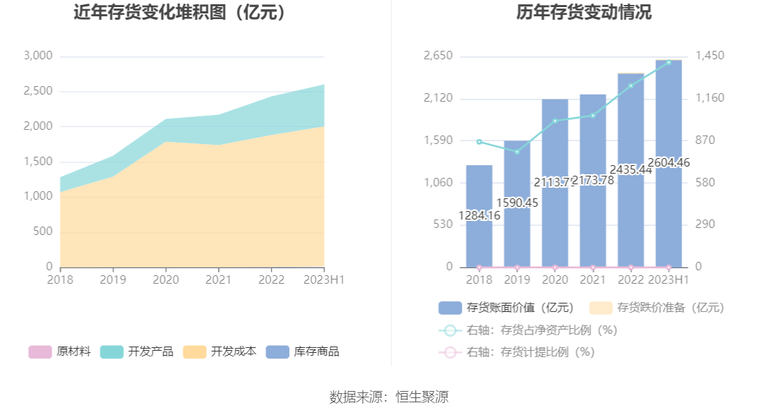 从存货变动来看,截至2023年上半年末,公司存货账面价值为2604.46亿元,占净资产的1409.28%,较上年末增加169.01亿元。其中,存货跌价准备为6.78亿元,计提比例为0.26%。