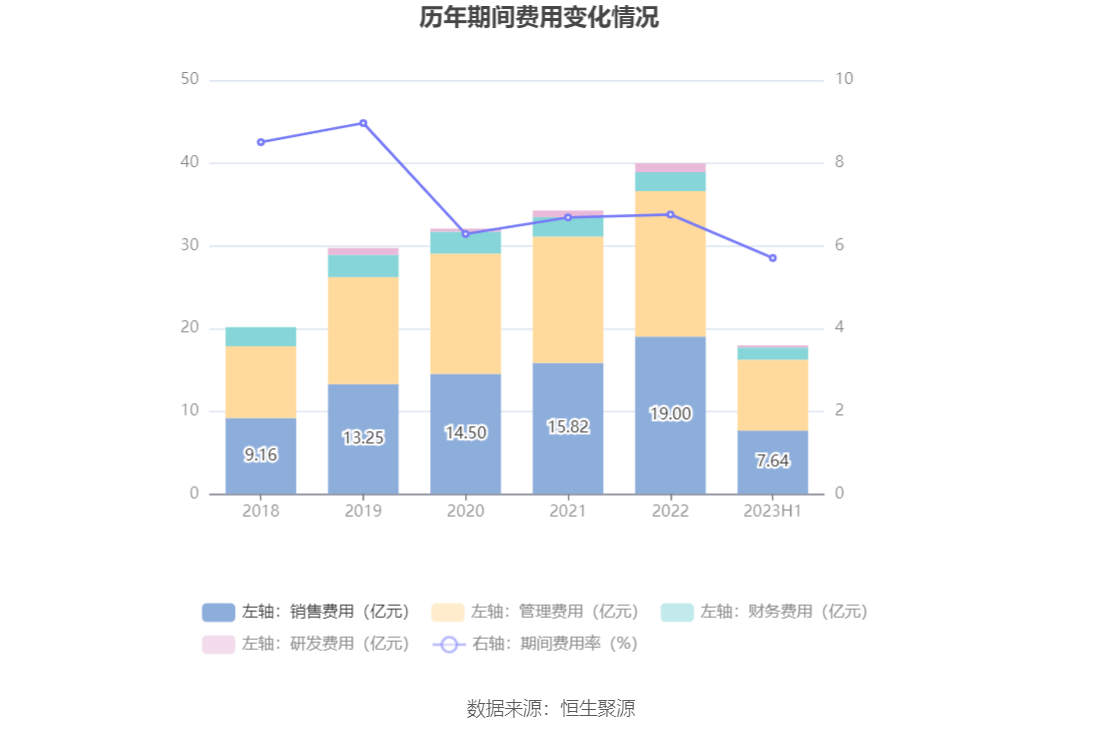 2023年上半年,公司期间费用为17.93亿元,较上年同期增加6998.41万元;但期间费用率为5.70%,较上年同期下降1.03个百分点。其中,销售费用同比增长33.64%,管理费用同比下降6.31%,研发费用同比下降29.12%,财务费用同比下降26.81%。