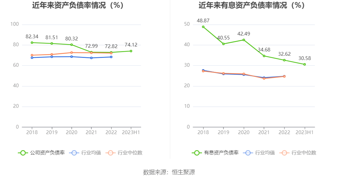 偿债能力方面,公司2023年二季度末资产负债率为74.12%,相比上年末增加1.30个百分点;有息资产负债率为30.58%,相比上年末减少2.04个百分点。