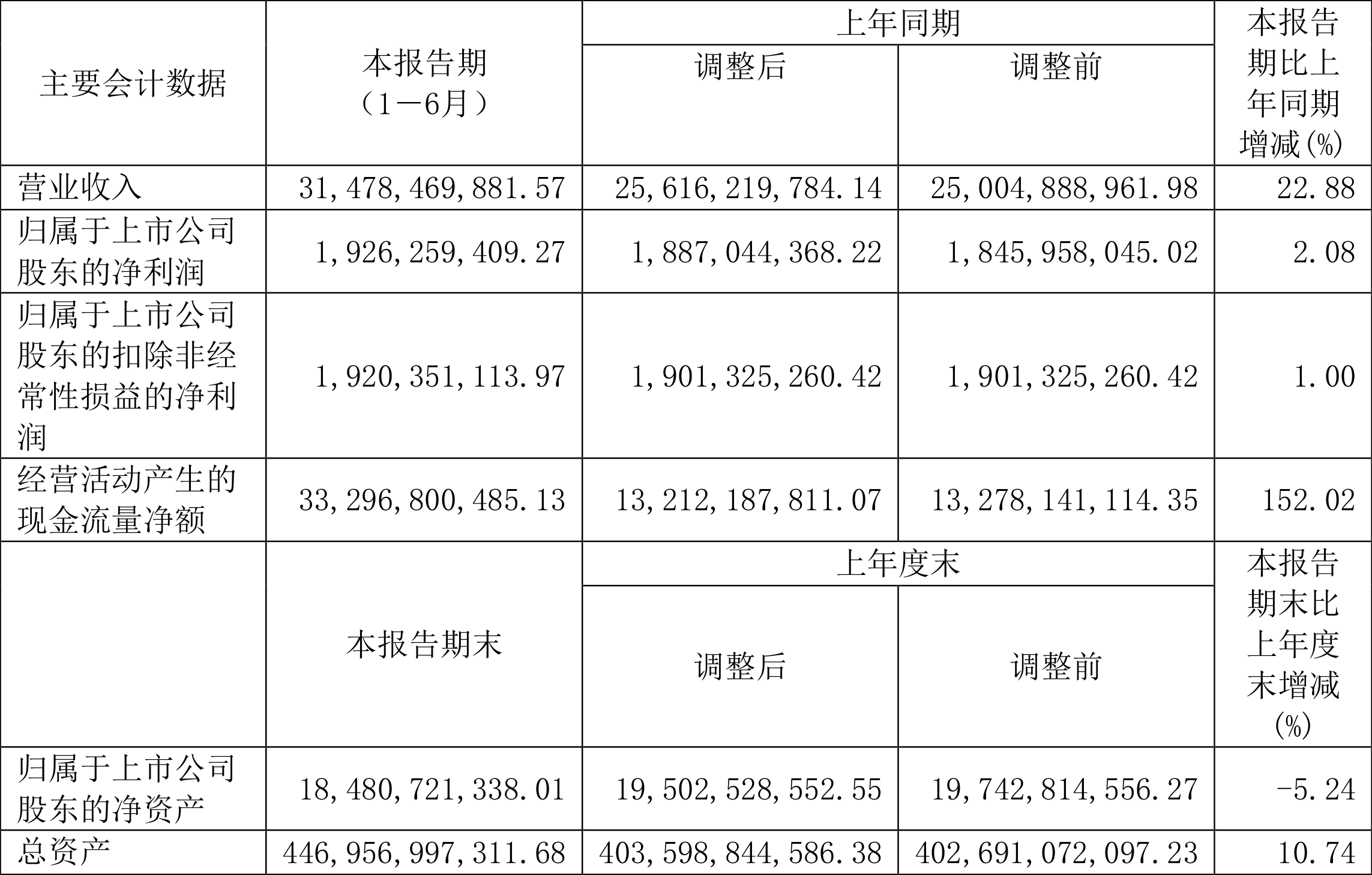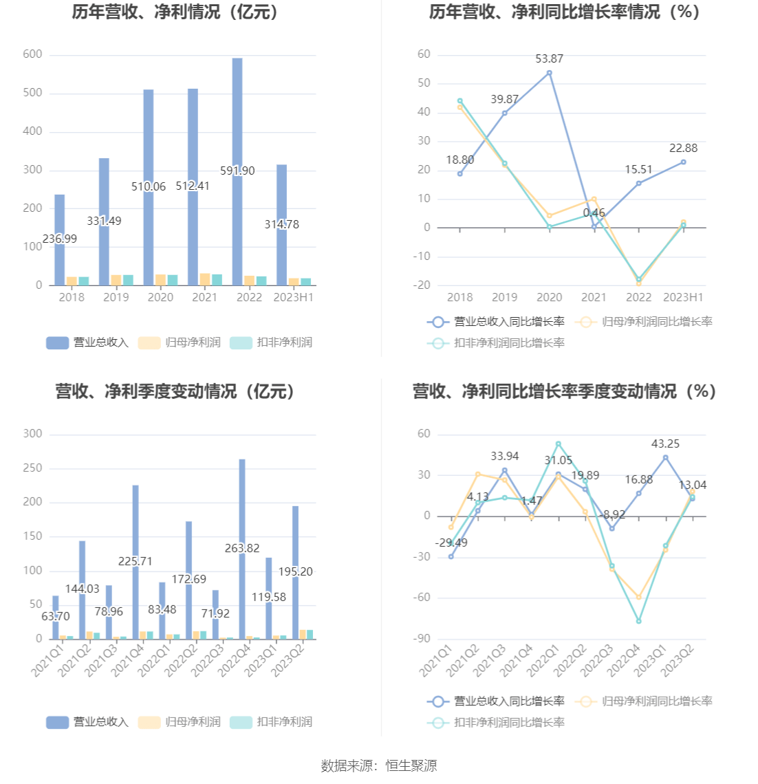 根据半年报,公司第二季度实现营业总收入195.2亿元,同比增长13.04%,环比增长63.23%;归母净利润13.87亿元,同比增长18.33%,环比增长156.93%;扣非净利润13.62亿元,同比增长14.36%,环比增长144.10%。