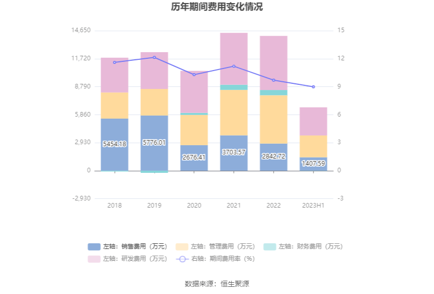 2023年上半年,公司期间费用为6615.03万元,较上年同期增加361.37万元;但期间费用率为8.99%,较上年同期下降0.27个百分点。其中,销售费用同比增长30.45%,管理费用同比增长1.48%,研发费用同比增长10.4%,财务费用由去年同期的260.25万元变为-17.52万元。