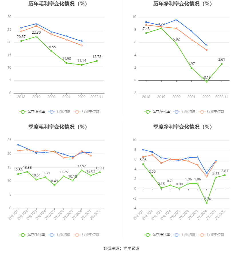 2023年上半年,公司毛利率为12.72%,同比上升2.54个百分点;净利率为2.61%,较上年同期上升2.02个百分点。从单季度指标来看,2023年第二季度公司毛利率为13.21%,同比上升1.46个百分点,环比上升1.18个百分点;净利率为2.81%,较上年同期上升1.75个百分点,较上一季度上升0.48个百分点。