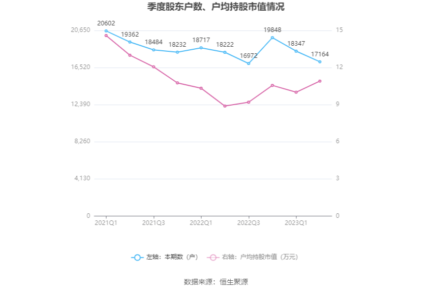 筹码集中度方面,截至2023年二季度末,公司股东总户数为1.72万户,较一季度末下降了1183户,降幅6.45%;户均持股市值由一季度末的10.01万元上升至10.91万元,增幅为8.99%。