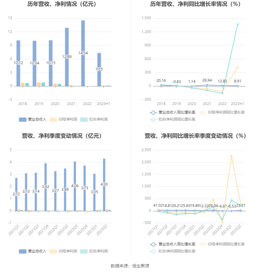 根据半年报,公司第二季度实现营业总收入4.3亿元,同比增长23.37%,环比增长40.92%;归母净利润1254.42万元,同比增长262.11%,环比增长81.57%;扣非净利润893.79万元,同比增长230.03%,环比增长56.85%。