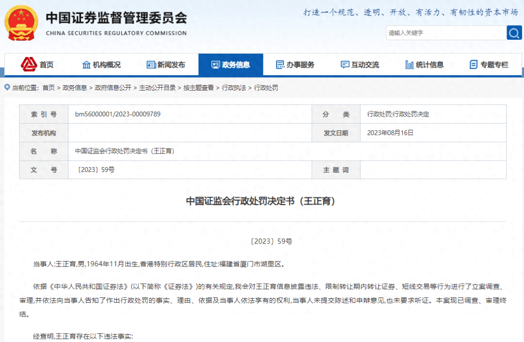 根据监管公布的案件细节,王正育被罚主要涉及信息披露违法行为、限制转让期内转让证券行为和短线交易行为三大问题。