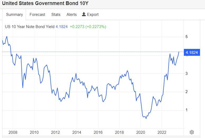 长期的抵押贷款利率往往会跟随无风险收益率基准——10年期美国国债收益率,因此当个人或机构投资者看到或预期基准利率上升时,他们采取的行动会推高收益率,进而抵押贷款利率随之升温。在美联储主席鲍威尔等官员近期频繁发出美联储将在更长的时间内维持较高利率(即higher for longer)的这一重要信号后,市场已开始消化美联储抛出的这一最新鹰派预期,因此有着“全球资产定价之锚”称号的10年期美债收益率应声攀升至2007年以来的最高点,且持续在这一高位附近运作。