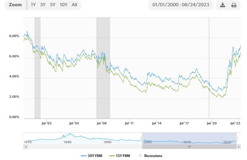 房利美经济学家团队在预测报告中强调,美国房屋销量放缓主要是由于“美联储长时间维持高基准利率”预期下抵押贷款利率迅速上升,本周美国抵押贷款利率飙升至20年来的新高。房地美报告称,最受购房者们欢迎的30年期美国固定抵押贷款利率截至上周飙升至7.23%,远高于一年前5.55%的利率和新冠疫情前3.9%的平均水平。这是自2001年以来的最高利率。