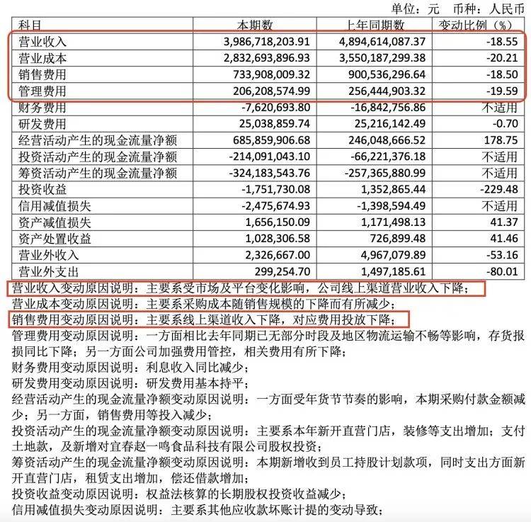 半年报显示,良品铺子的营业收入、营业成本及各项费用均下降。公司解释称,主要系受市场及平台变化影响,公司线上渠道营业收入下降。