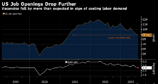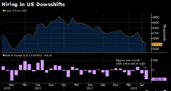 招聘人数降至2021年1月以来的最低水平。最近两个月招聘人数减少了458,000人,为2020年底以来的最大降幅。