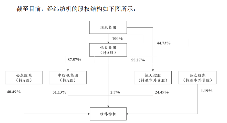 经纬纺机的控股股东为中纺机集团,实控人为中国机械工业集团有限公司(简称“国机集团”)。据了解,经纬纺机目前总股本为7.04亿股,其中流通A股为5.23亿股,退市外资股为1.81亿股。其中,中纺机集团持有经纬纺机2.19亿股A股股份,占经纬纺机总股本的比例为31.13%。恒天控股持有经纬纺机1.72亿股退市外资股股份,占经纬纺机总股本的比例为24.49%。恒天集团持有经纬纺机1901万股A股股份,占经纬纺机总股本的比例为2.70%。中纺机集团、恒天控股与恒天集团均为国机集团直接或间接控制的下属企业,为一致行动人。