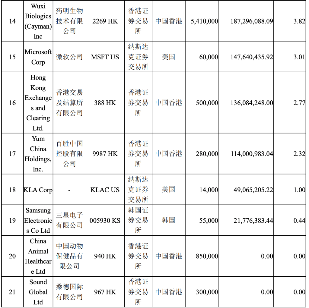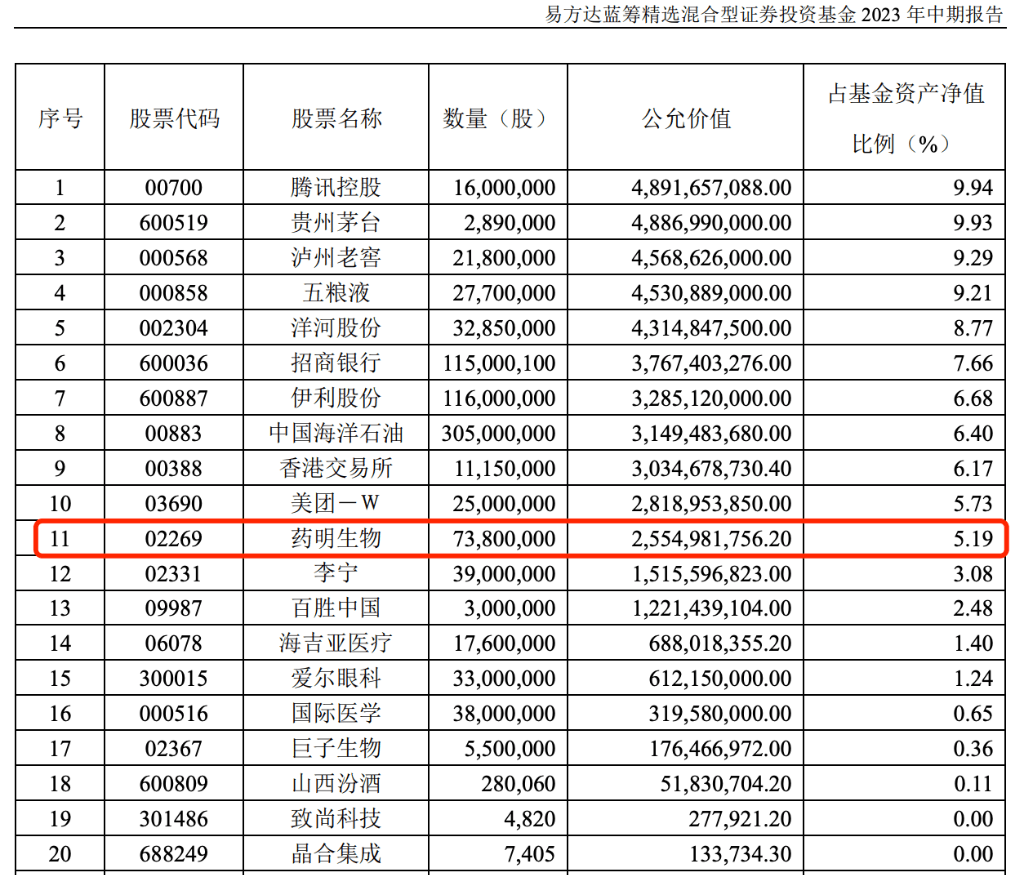 恰恰相反,中报显示,药明生物是易方达蓝筹的第11大持仓,占基金资产比例近5.2%。