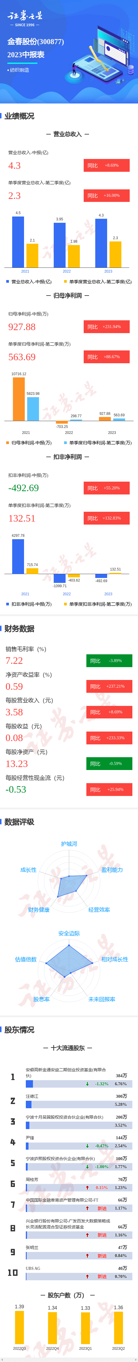 金春股份2023中报显示,公司主营收入4.3亿元,同比上升8.69%;归母净利润927.89万元,同比上升231.94%;扣非净利润-492.69万元,同比上升55.2%;其中2023年第二季度,公司单季度主营收入2.31亿元,同比上升16.0%;单季度归母净利润563.7万元,同比上升88.67%;单季度扣非净利润132.52万元,同比上升132.83%;负债率14.59%,投资收益930.52万元,财务费用151.19万元,毛利率7.22%。