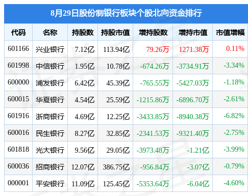 北向资金方面,当日股份制银行板块北向资金持股市值为782.05亿元,减持13.62亿元。其中增持最多的是兴业银行,增持了0.13亿元。减持持最多的是平安银行,减持了6.04亿元。股份制银行板块北向资金持股变动明细见下表: