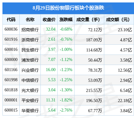8月29日股份制银行板块较上一交易日下跌1.14%,华夏银行领跌。当日上证指数报收于3135.89,上涨1.2%。深证成指报收于10454.98,上涨2.17%。股份制银行板块个股涨跌见下表: