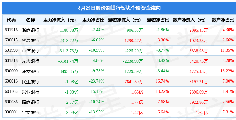 从资金流向上来看,当日股份制银行板块主力资金净流出9.77亿元,游资资金净流入5.34亿元,散户资金净流入4.43亿元。股份制银行板块个股资金流向见下表: