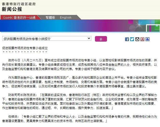 8月29日,中国香港特区政府发布新闻公报,宣布成立促进股票市场流动性专责小组,以全面检视影响股票市场流动性的因素,并向行政长官提交改善建议。专责小组成员包括其他八位来自金融业界的人士、相关政府官员,以及金融监管机构和香港交易及结算所有限公司的代表。专责小组将于短期内召开会议。