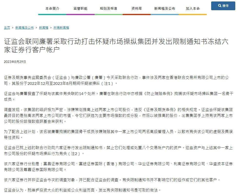 8月29日,香港证券及期货事务监察委员会官网消息,香港证监会与廉政公署今天采取联合行动,事件涉及两家在香港联合交易所有限公司上市的公司,其股份于2022年12月至2023年8月期间怀疑被操纵香港证监会与廉署搜查了怀疑与该案件有关联的14个处所。