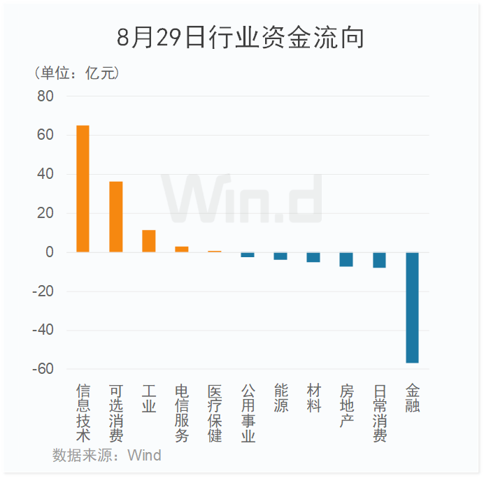 从8月29日行业资金流向来看,主力资金净流入30多亿元。其中,信息技术板块净流入额超60亿元,位居首位;可选消费、工业等板块净流入额居前。金融板块大幅净流出50多亿元,日常消费、房地产等板块亦小幅金流出。
