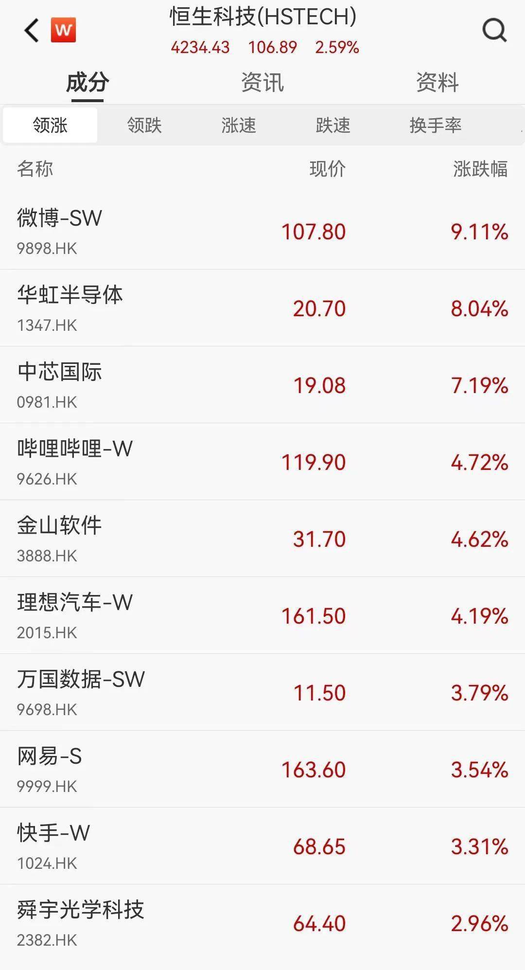 热门科技股多数上涨,恒生科技指数成分中,微博涨9.1%,华虹半导体涨8%,中芯国际涨7.2%,哔哩哔哩涨4.7%。