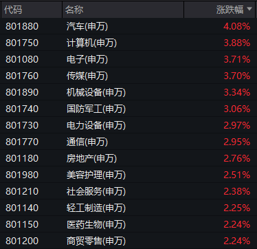 同时,计算机、电子、传媒、机械设备、国防军工等板块,同样涨幅居前,悉数涨超3%,分别上行3.88%、3.71%、3.70%、3.34%、3.06%。房地产、医药生物、通信等热门板块,涨幅均同样超过2%。