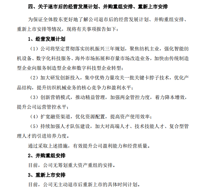 关于退市后的经营发展计划、并购重组安排、重新上市安排,经纬纺机在公告中表示,公司将坚定贯彻落实纺机振兴三年规划,聚焦纺机主业,强化智能纺机设备、数字化科技服务、海外市场拓展和存量市场改造业务,加快由传统制造型企业向服务制造型企业和数字科技型企业转型。