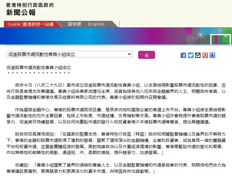 8月29日下午,中国香港特区政府发布新闻公报,宣布成立促进股票市场流动性专责小组,以全面检视影响股票市场流动性的因素,并向行政长官提交改善建议。